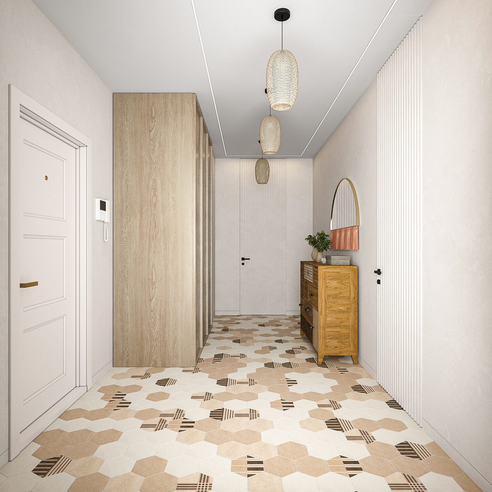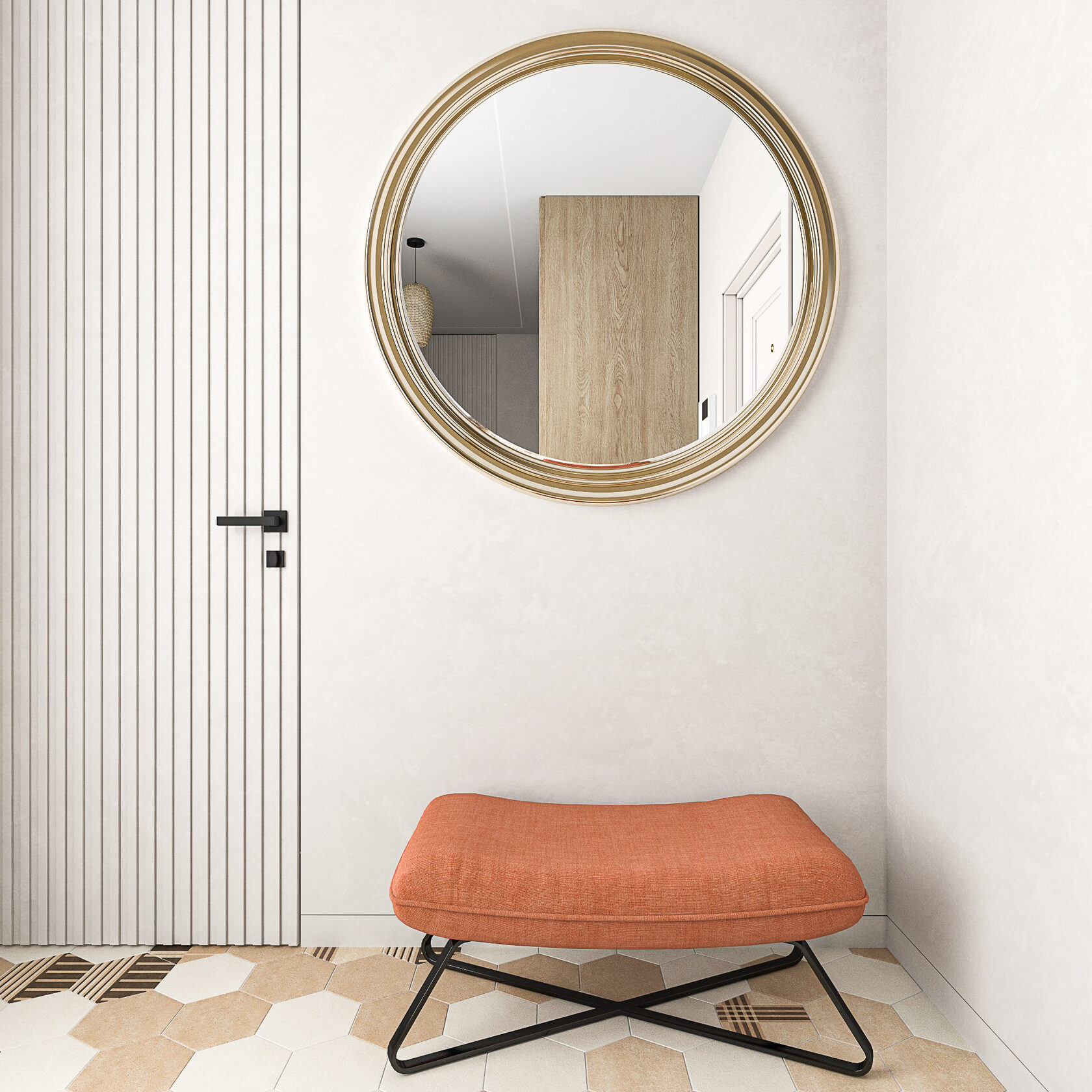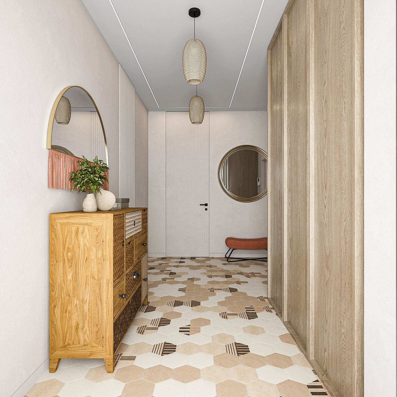 В холле расположился шкаф, комод и два зеркала. Проект включает визуализации помещений и комплект чертежей для ремонта: обмерный и монтажный планы, зонирование, план мебели, маршрутов передвижения, планы