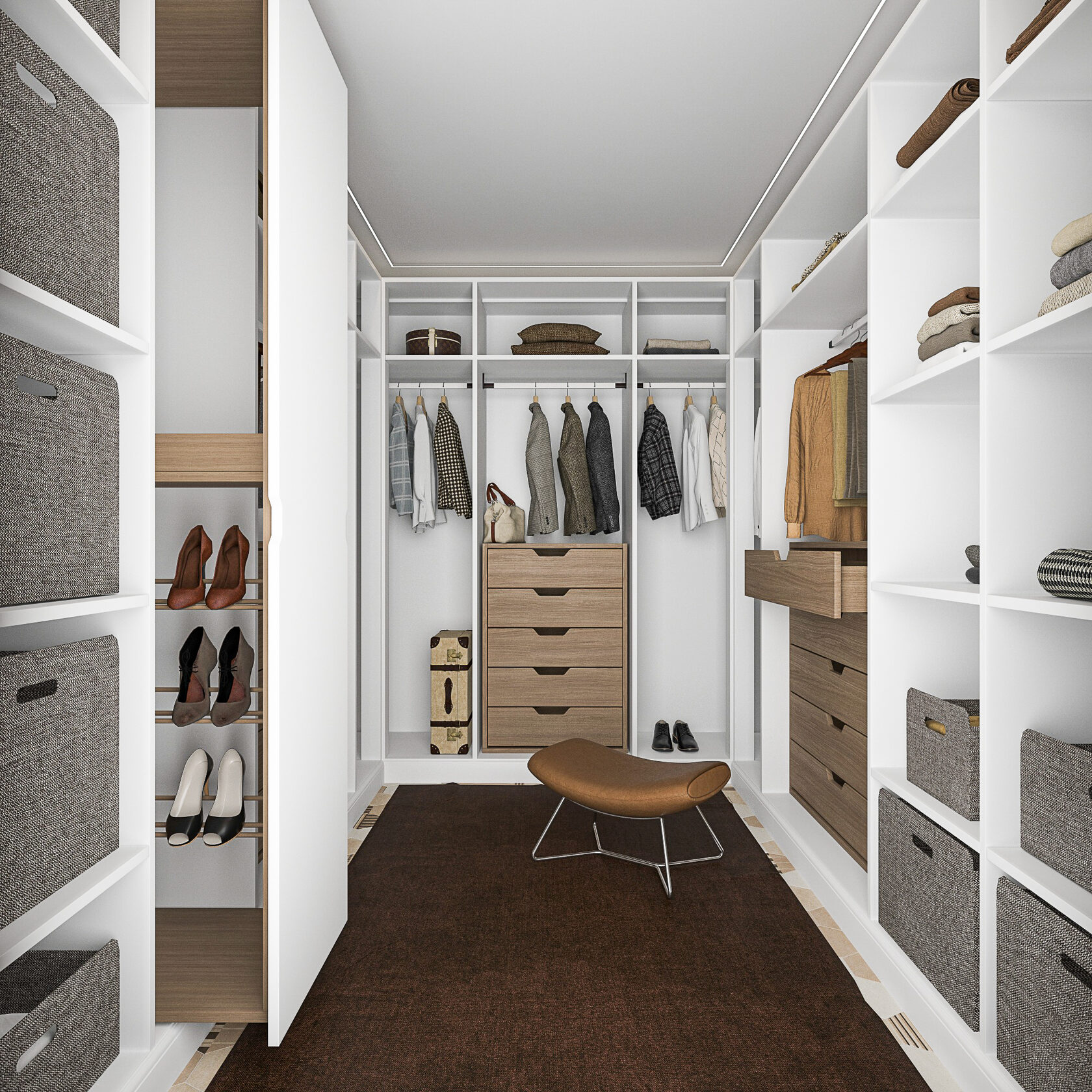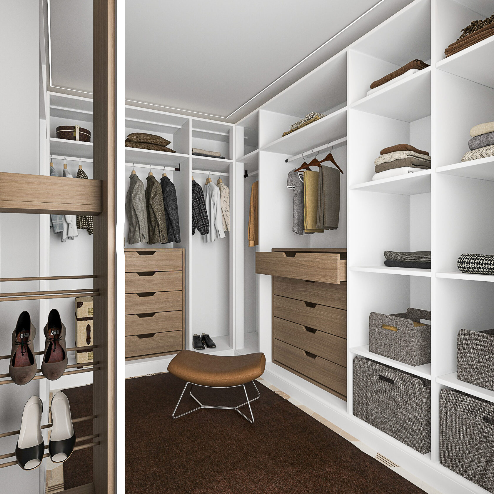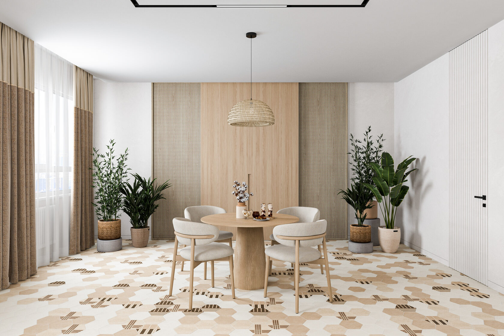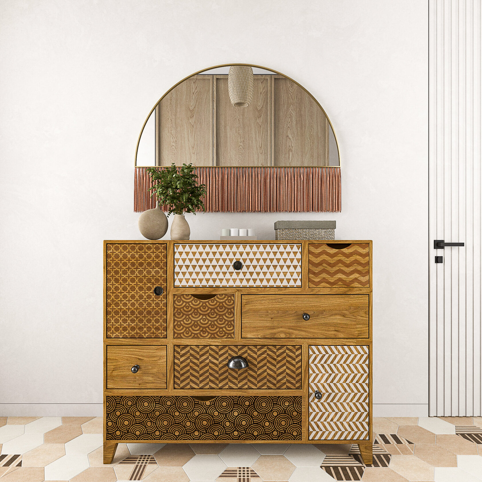 В холле расположился шкаф, комод и два зеркала. Проект включает визуализации помещений и комплект чертежей для ремонта: обмерный и монтажный планы, зонирование, план мебели, маршрутов передвижения, планы