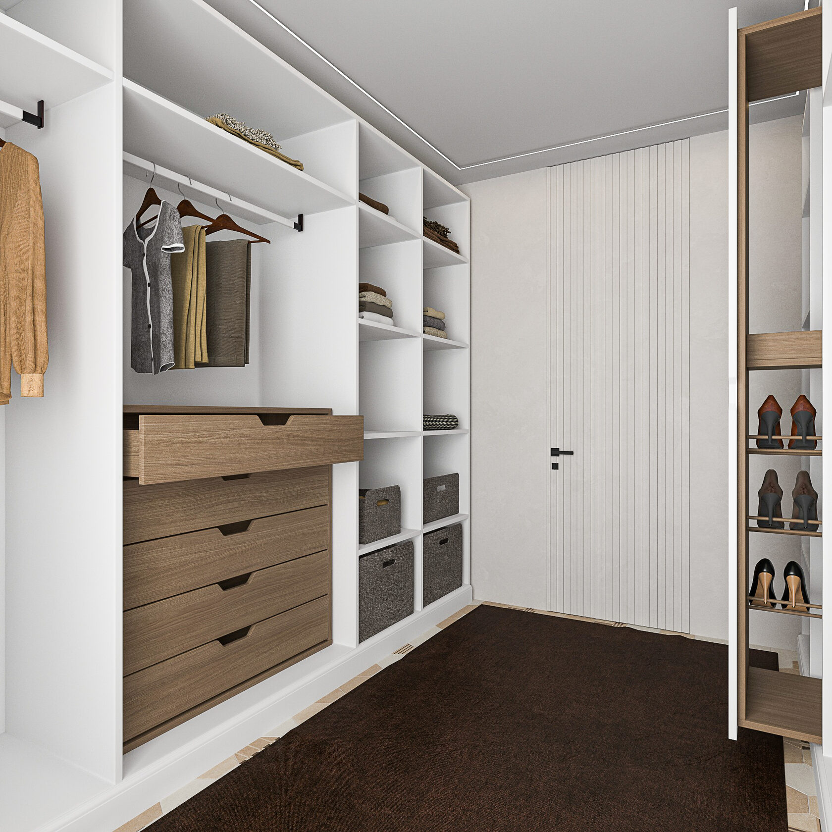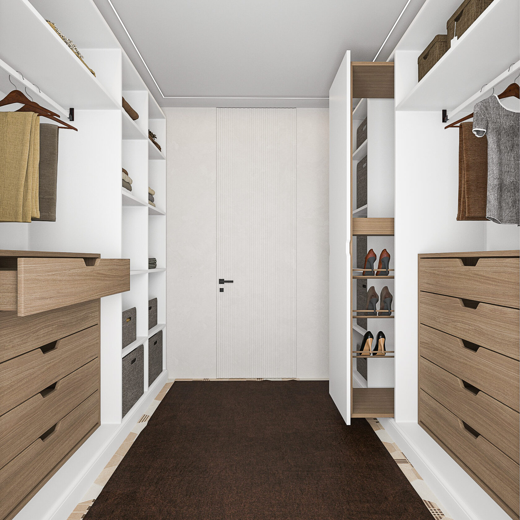 В проекте использовались двери скрытого монтажа. Стены для установки таких дверей должны быть ровными. Эти двери можно красить, клеить на них обои и наносить декоративную штукатурку. Стильные черные ручки подчеркивают изысканность и лаконичность интерьера. Не все знают, что ремонт лучше всего начинать с санузлов. В проектировании очень важен уровень чистого пола. Под него подгоняется уровень пола в остальных комната. Кроме того, при укладке плитки возникает много строительной пыли. Чтобы она не оседала на обоях и мебели нужно строго соблюдать порядок отделочных работ.