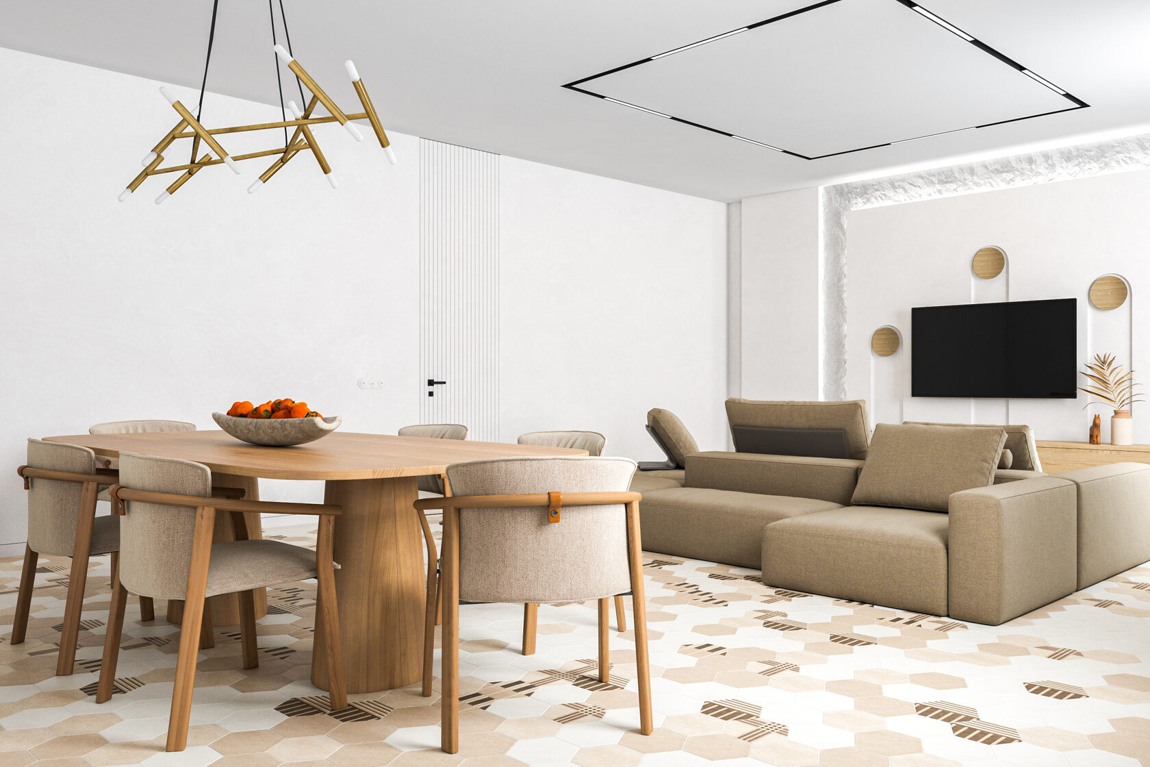 В холле расположился шкаф, комод и два зеркала. Проект включает визуализации помещений и комплект чертежей для ремонта: обмерный и монтажный планы, зонирование, план мебели, маршрутов передвижения, планы полов