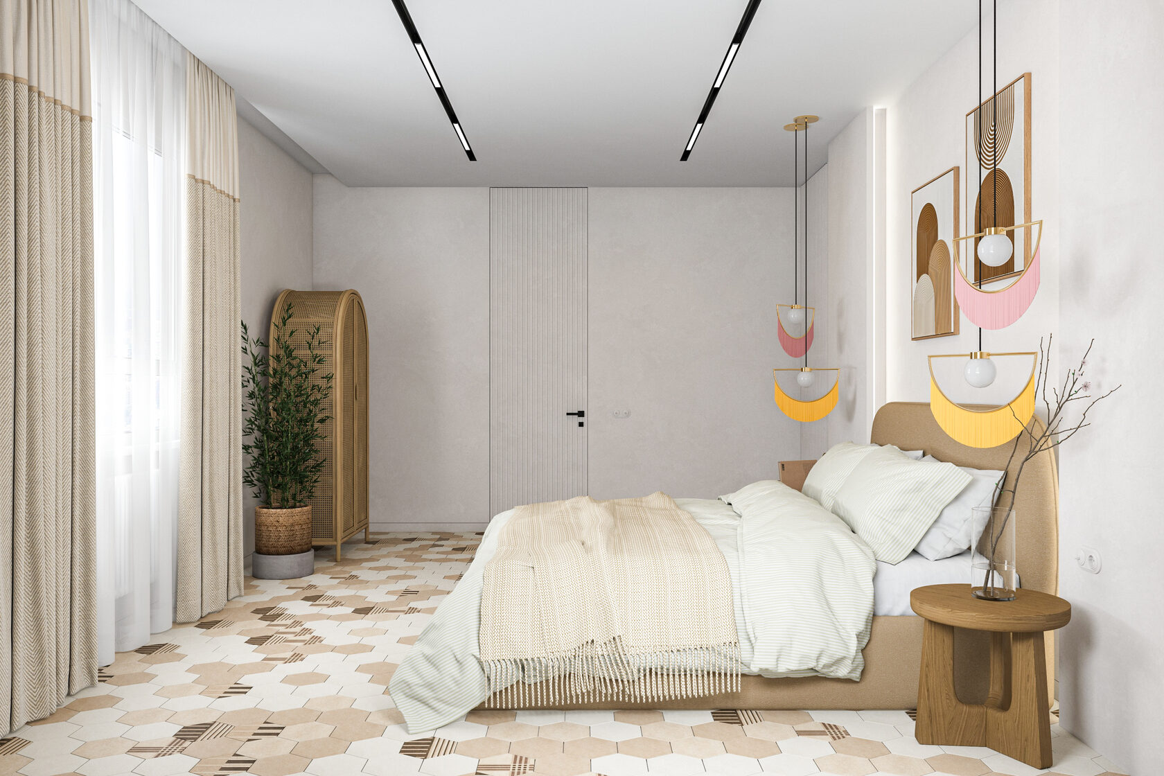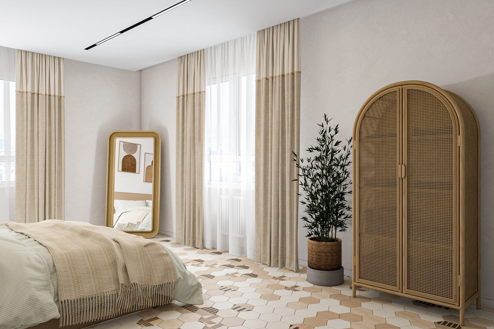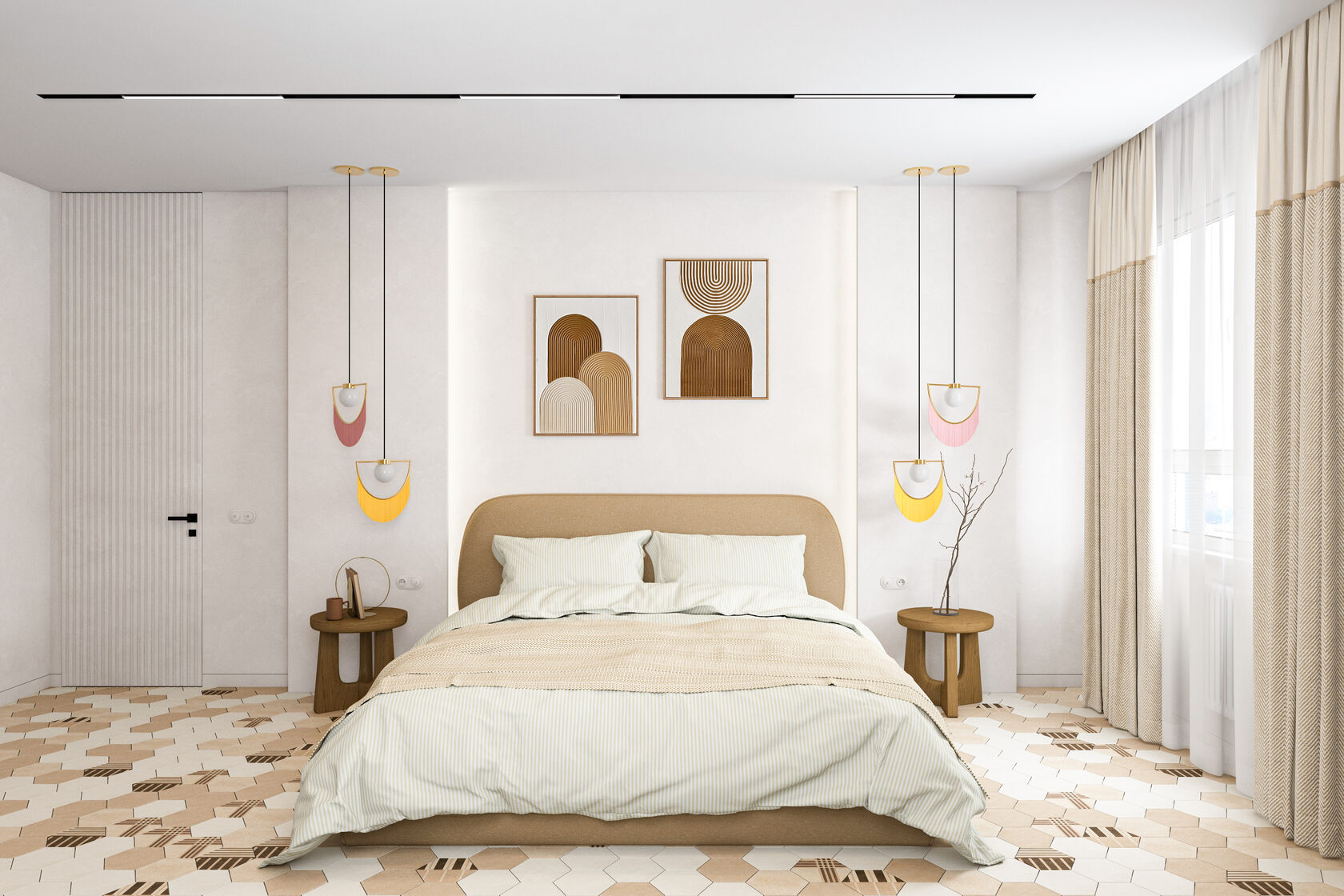 По проекту спальня соседствует с кабинетом. Было важно предусмотреть сочетание цветов в этих комнатах. Теплая цветовая гамма создает уютную атмосферу. Одинаковые шторы объединяют помещения в единую композицию. Комната отделана от кабинета дверями. Кровать коричневого цвета с мягким изголовьем оснащена хорошим ортопедическим матрацем. Рядом разместились прикроватные тумбочки интересной круглой формы. Над каждой тумбой висят стильные светильники. Благодаря перепланировке удалось выиграть дополнительное место в кабинете и разместить там систему хранения.