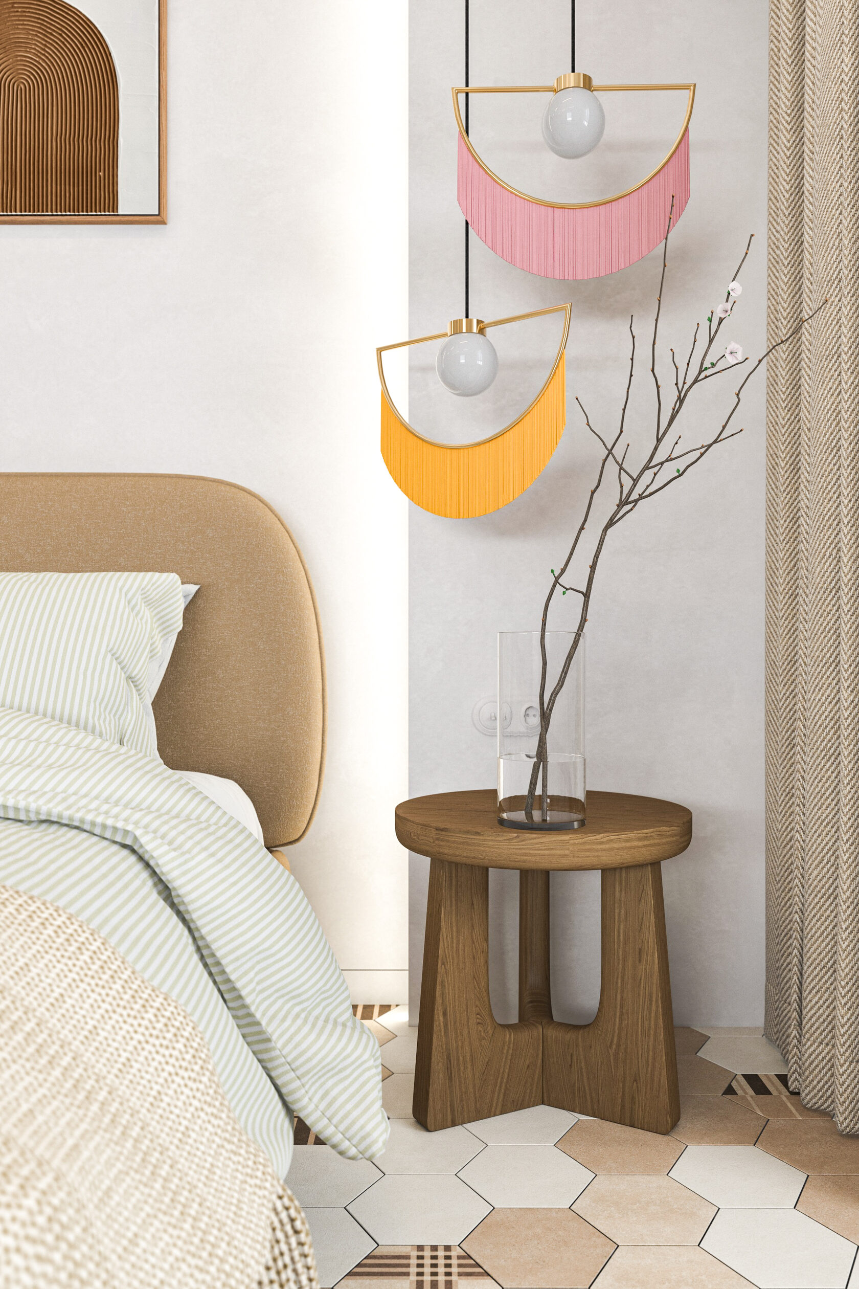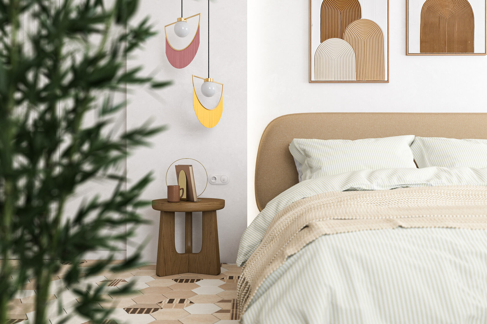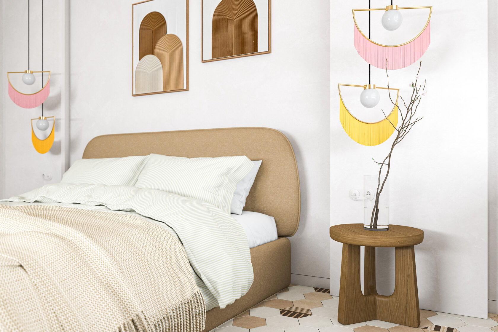 По проекту спальня соседствует с кабинетом. Было важно предусмотреть сочетание цветов в этих комнатах. Теплая цветовая гамма создает уютную атмосферу. Одинаковые шторы объединяют помещения в единую композицию. Комната отделана от кабинета дверями. Кровать коричневого цвета с мягким изголовьем оснащена хорошим ортопедическим матрацем. Рядом разместились прикроватные тумбочки интересной круглой формы. Над каждой тумбой висят стильные светильники. Благодаря перепланировке удалось выиграть дополнительное место в кабинете и разместить там систему хранения.