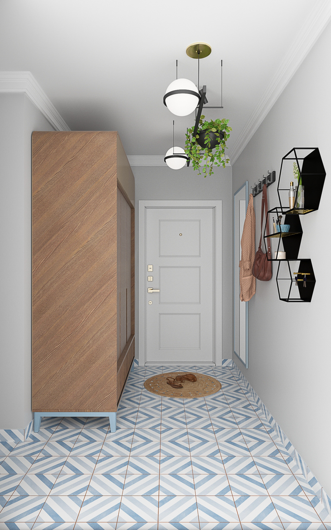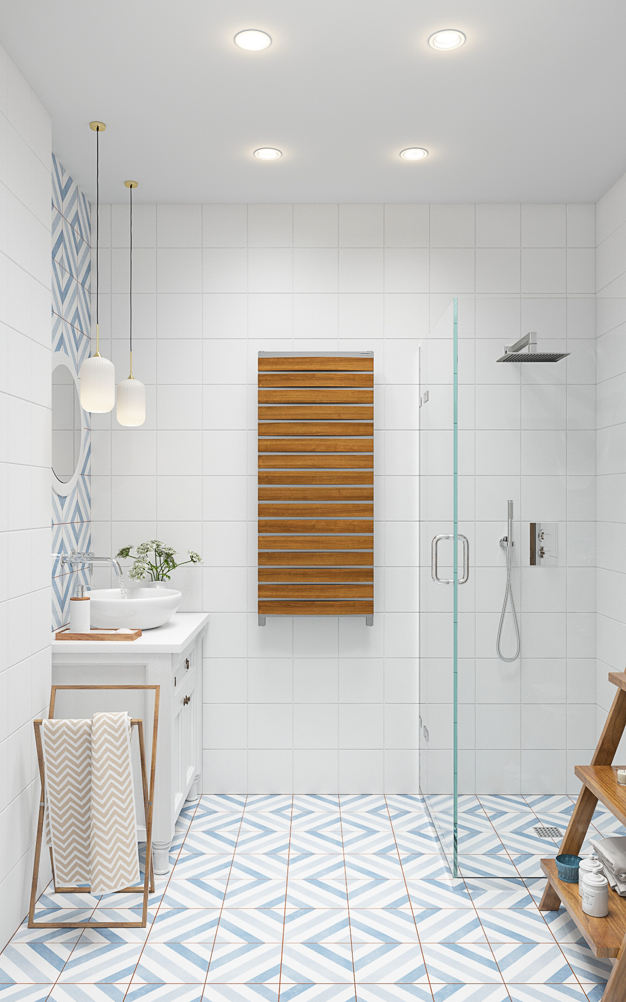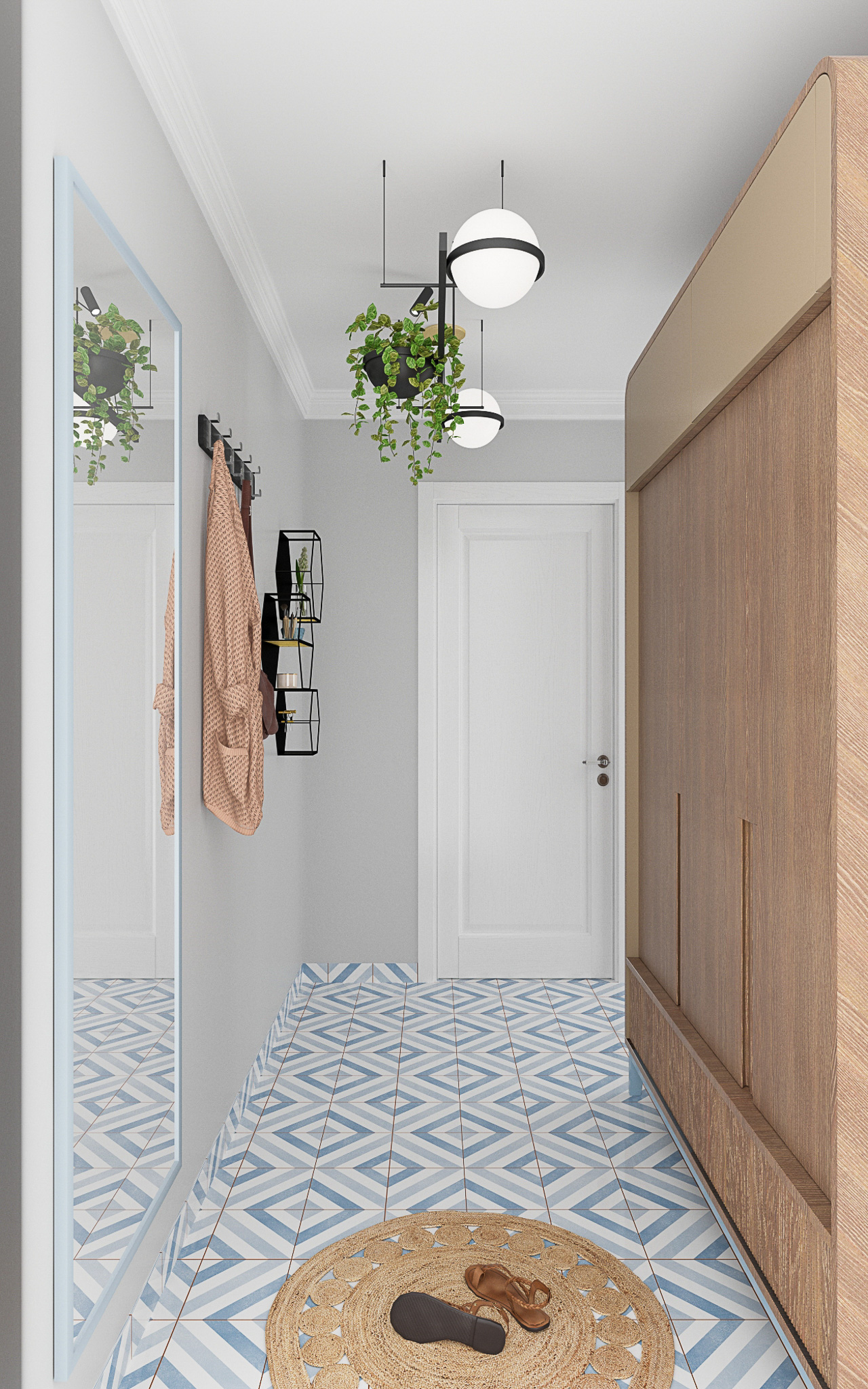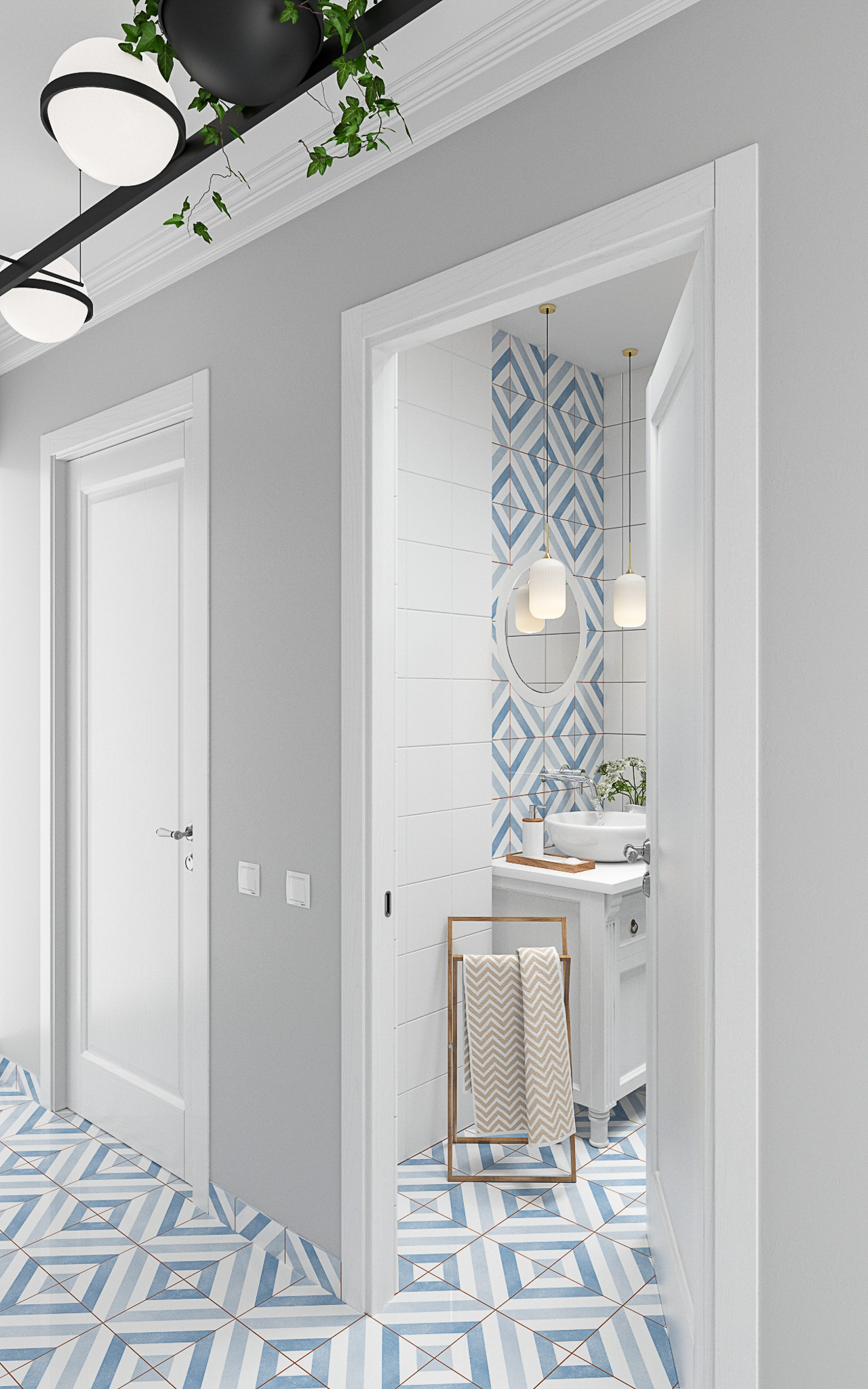 Стены в ванной комнате и туалете выложены белой плиткой, а пол яркий с орнаментом. Это классический прием в оформлении сканди. При монтаже инсталляции с подвесным унитазом получилась полочка, которую мы украсили керамическим декором. В туалете установили унитаз с инсталляцией. Он дороже обычного, но имеет свои плюсы: во-первых, уменьшается расход жидкости, во-вторых, бачек спрятан за стенкой и работает тише, удобно мыть пол. Кроме того, появляется место для установки бойлера.