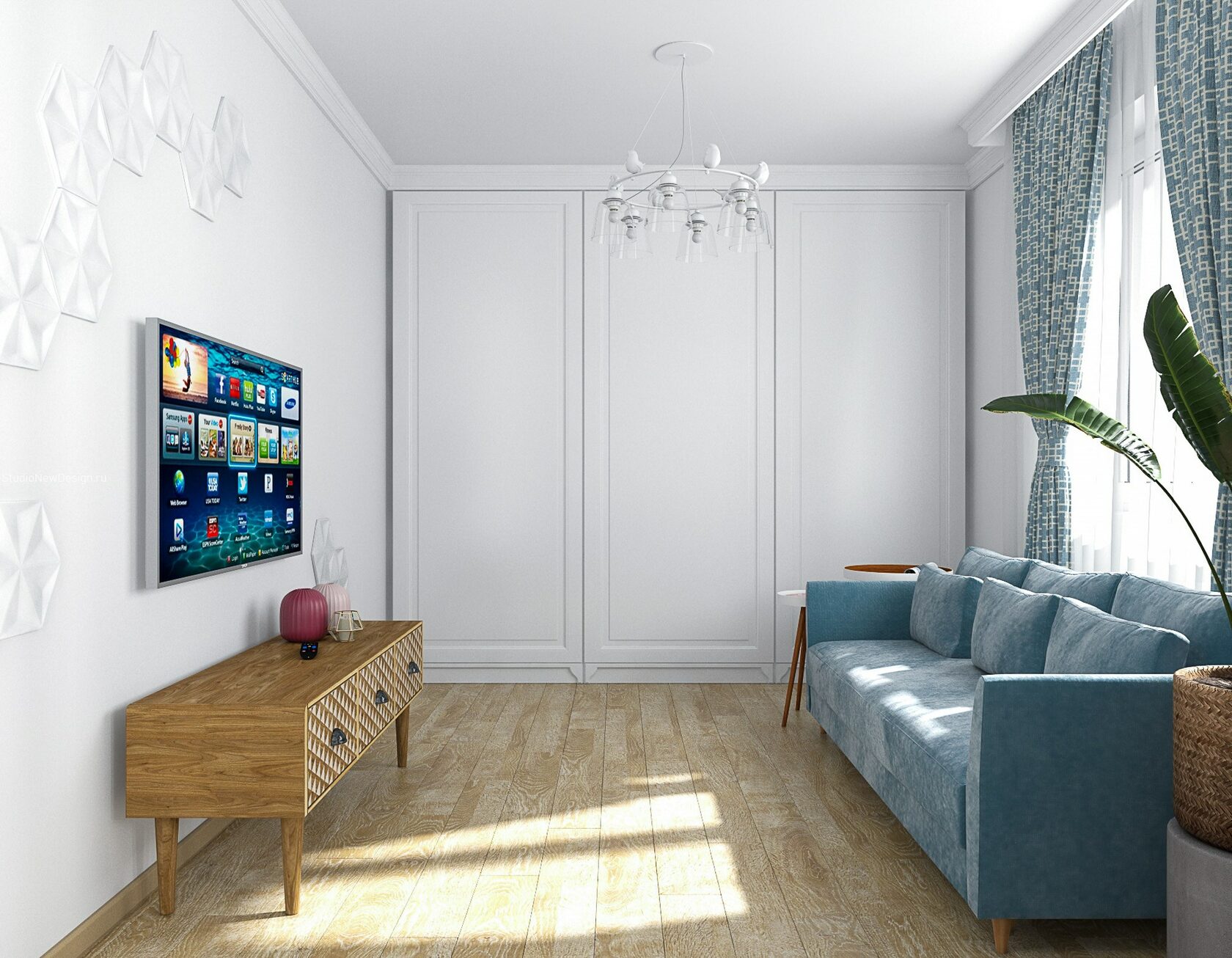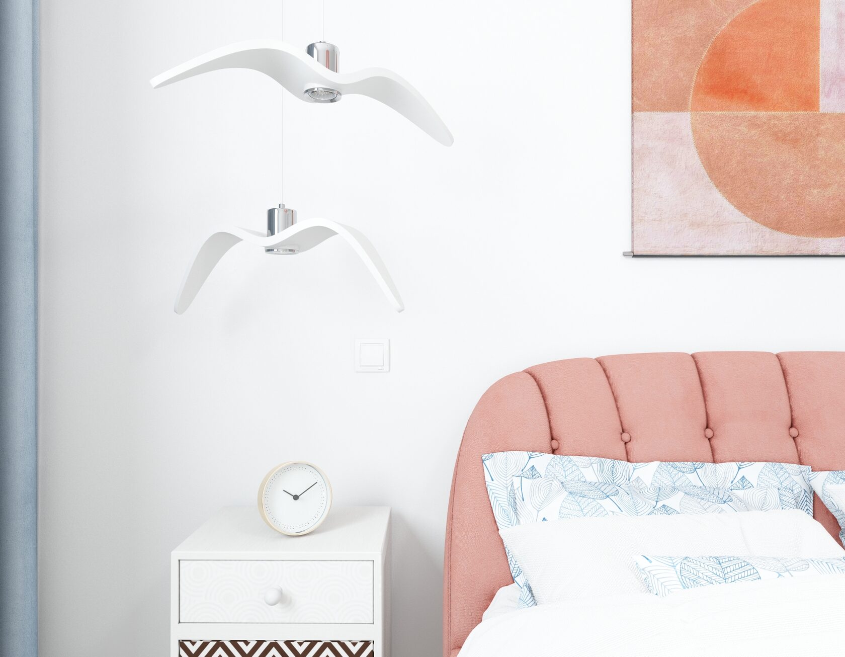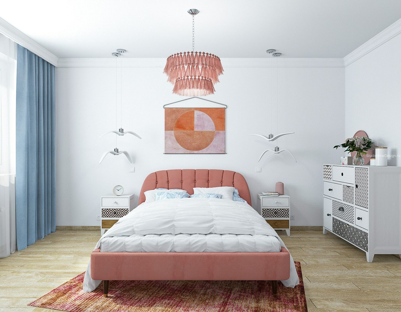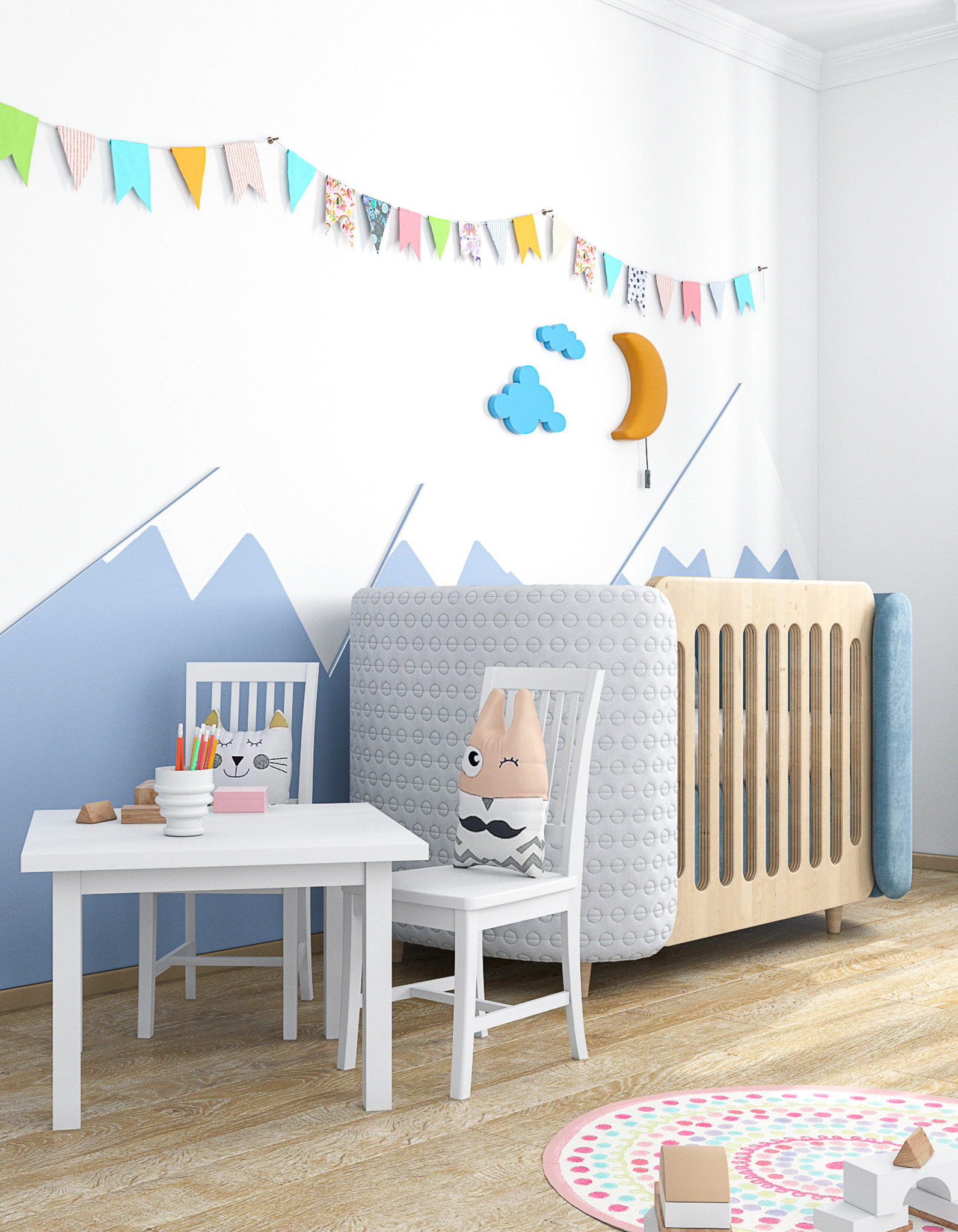 Стены в ванной комнате и туалете выложены белой плиткой, а пол яркий с орнаментом. Это классический прием в оформлении сканди. При монтаже инсталляции с подвесным унитазом получилась полочка, которую мы украсили керамическим декором. В туалете установили унитаз с инсталляцией. Он дороже обычного, но имеет свои плюсы: во-первых, уменьшается расход жидкости, во-вторых, бачек спрятан за стенкой и работает тише, удобно мыть пол. Кроме того, появляется место для установки бойлера.