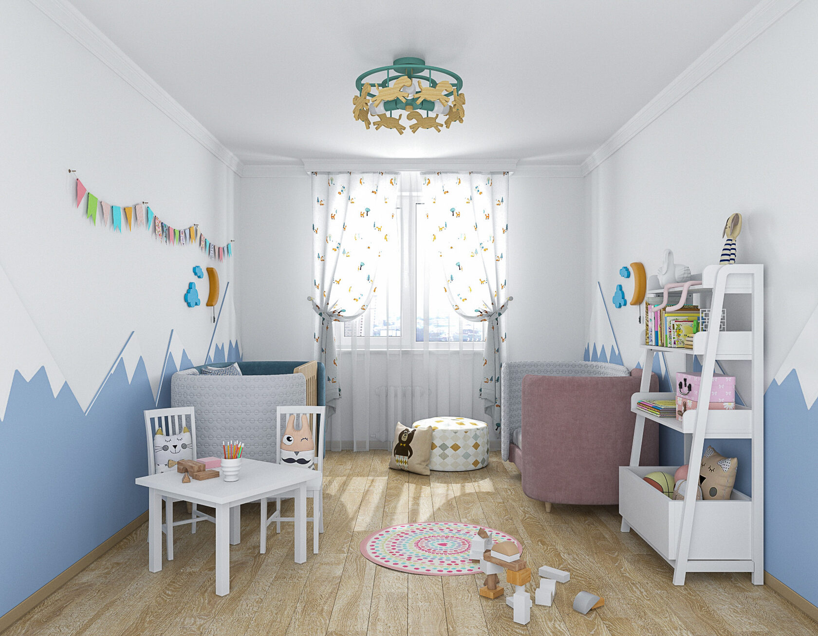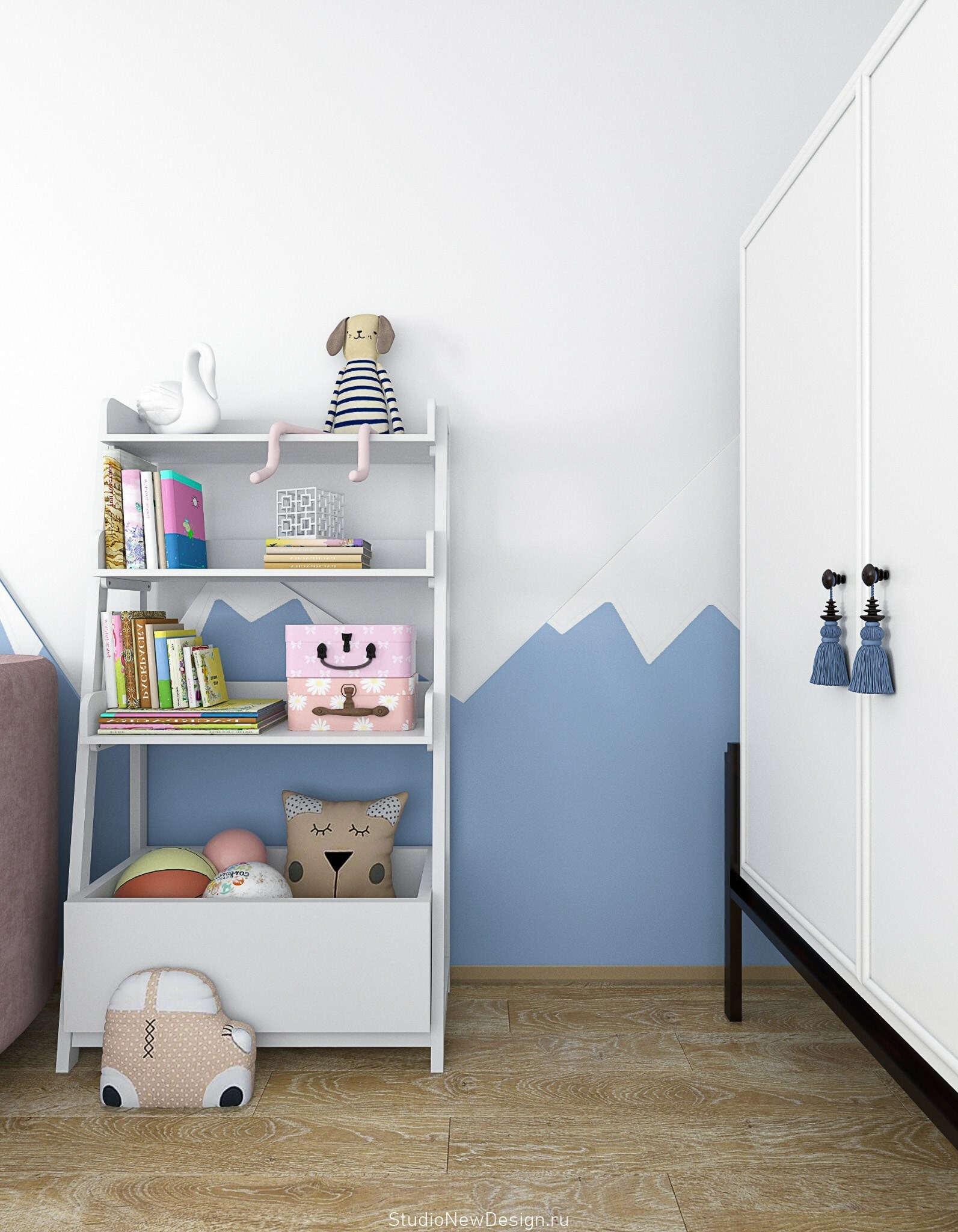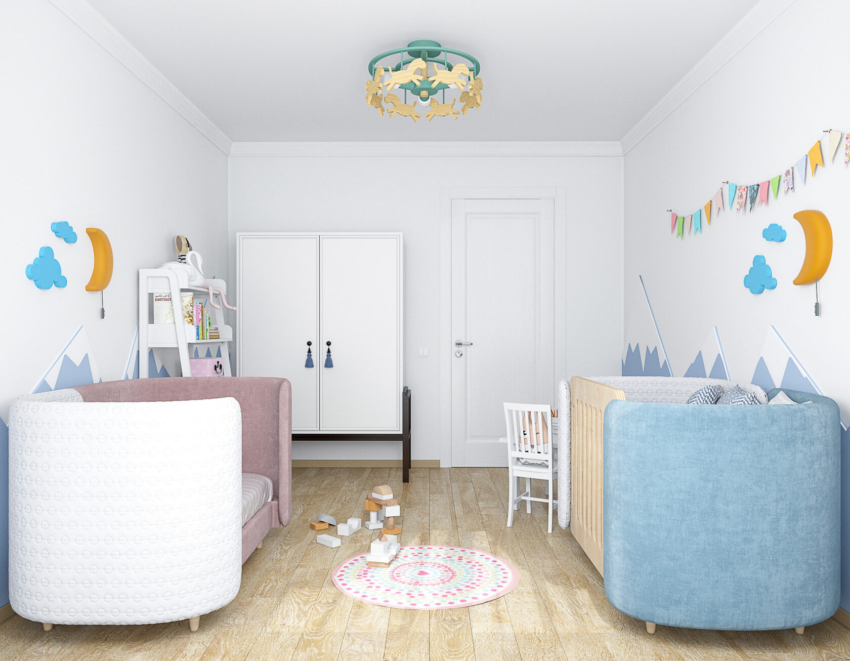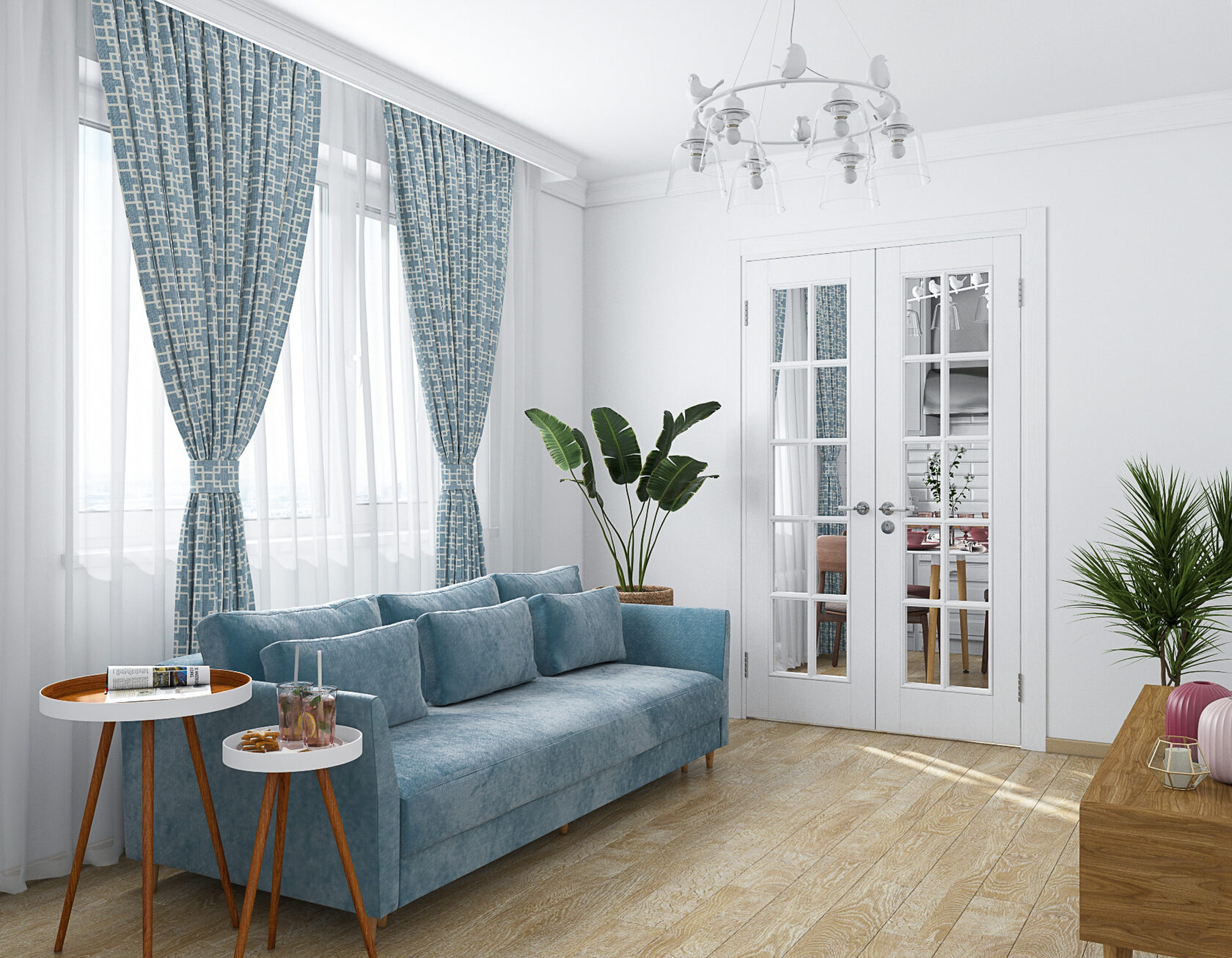 Стены в ванной комнате и туалете выложены белой плиткой, а пол яркий с орнаментом. Это классический прием в оформлении сканди. При монтаже инсталляции с подвесным унитазом получилась полочка, которую мы украсили керамическим декором. В туалете установили унитаз с инсталляцией. Он дороже обычного, но имеет свои плюсы: во-первых, уменьшается расход жидкости, во-вторых, бачек спрятан за стенкой и работает тише, удобно мыть пол. Кроме того, появляется место для установки бойлера.