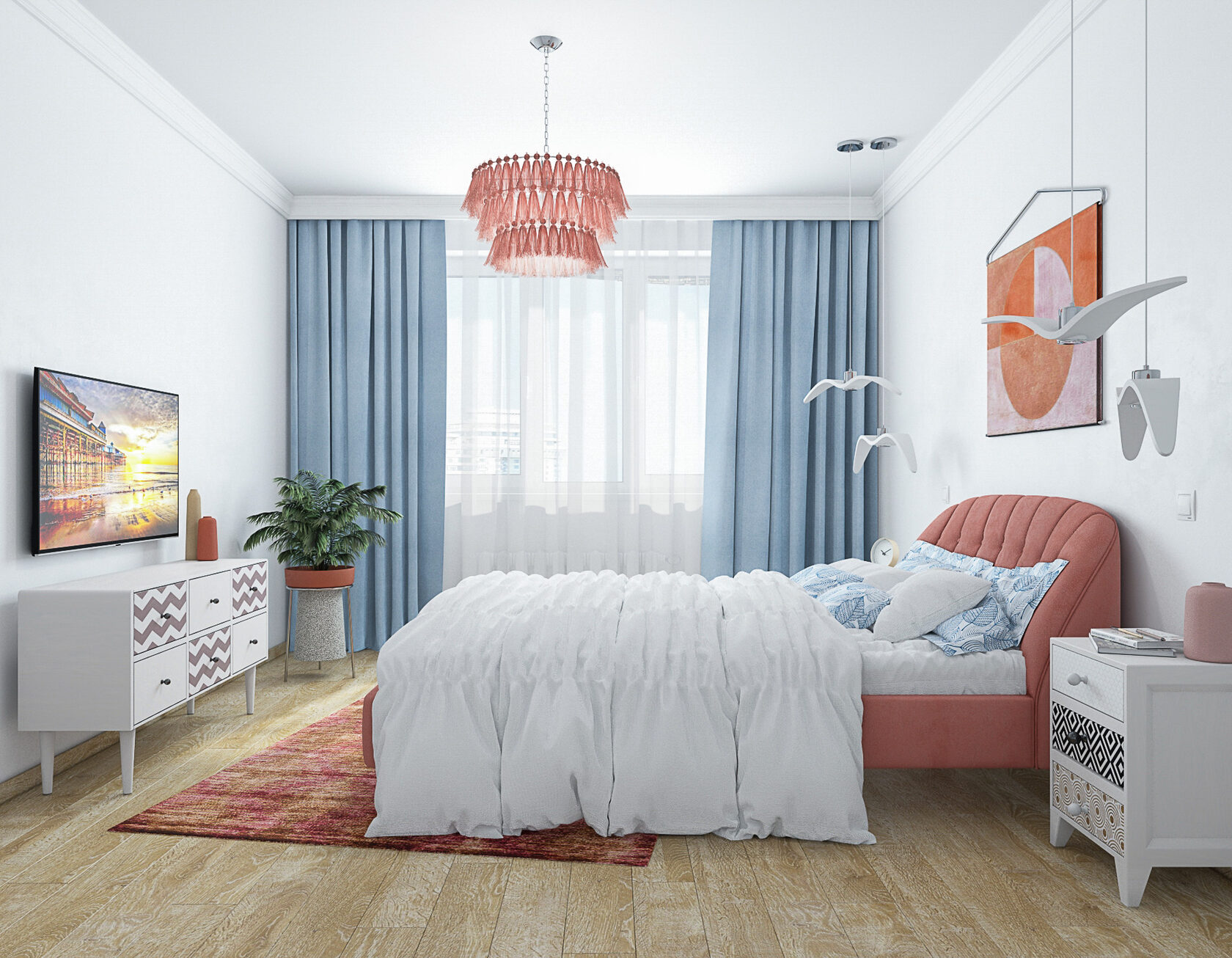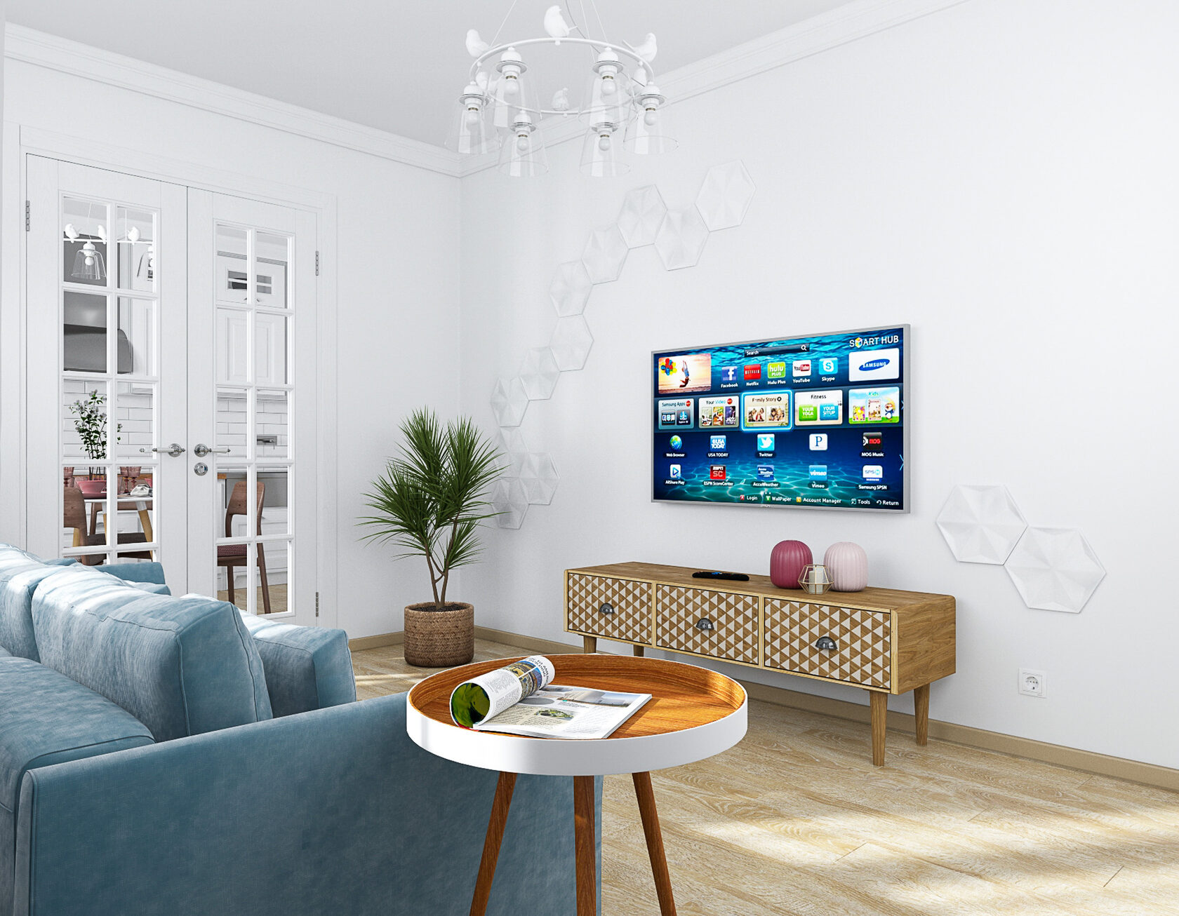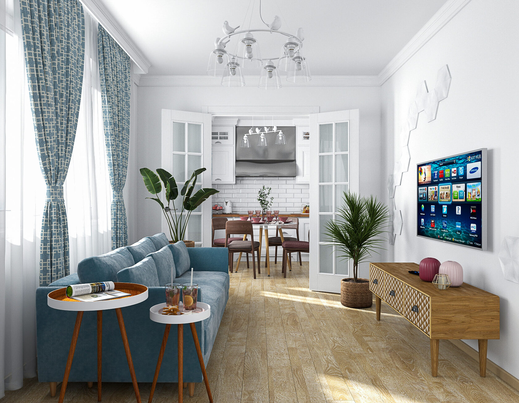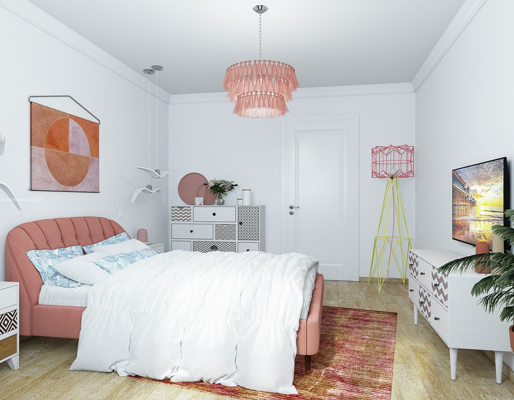 Стены в ванной комнате и туалете выложены белой плиткой, а пол яркий с орнаментом. Это классический прием в оформлении сканди. При монтаже инсталляции с подвесным унитазом получилась полочка, которую мы украсили керамическим декором. В туалете установили унитаз с инсталляцией. Он дороже обычного, но имеет свои плюсы: во-первых, уменьшается расход жидкости, во-вторых, бачек спрятан за стенкой и работает тише, удобно мыть пол. Кроме того, появляется место для установки бойлера.