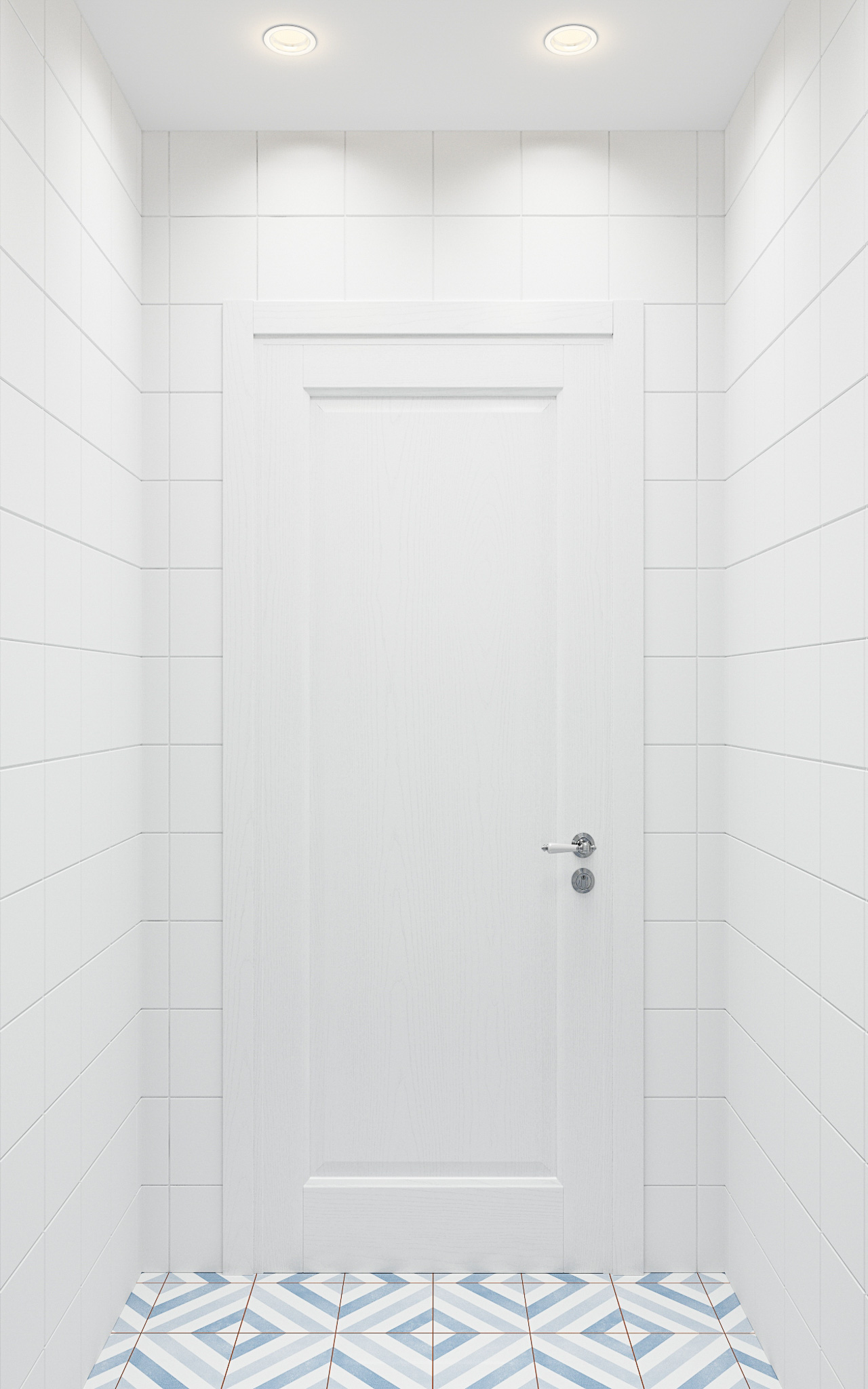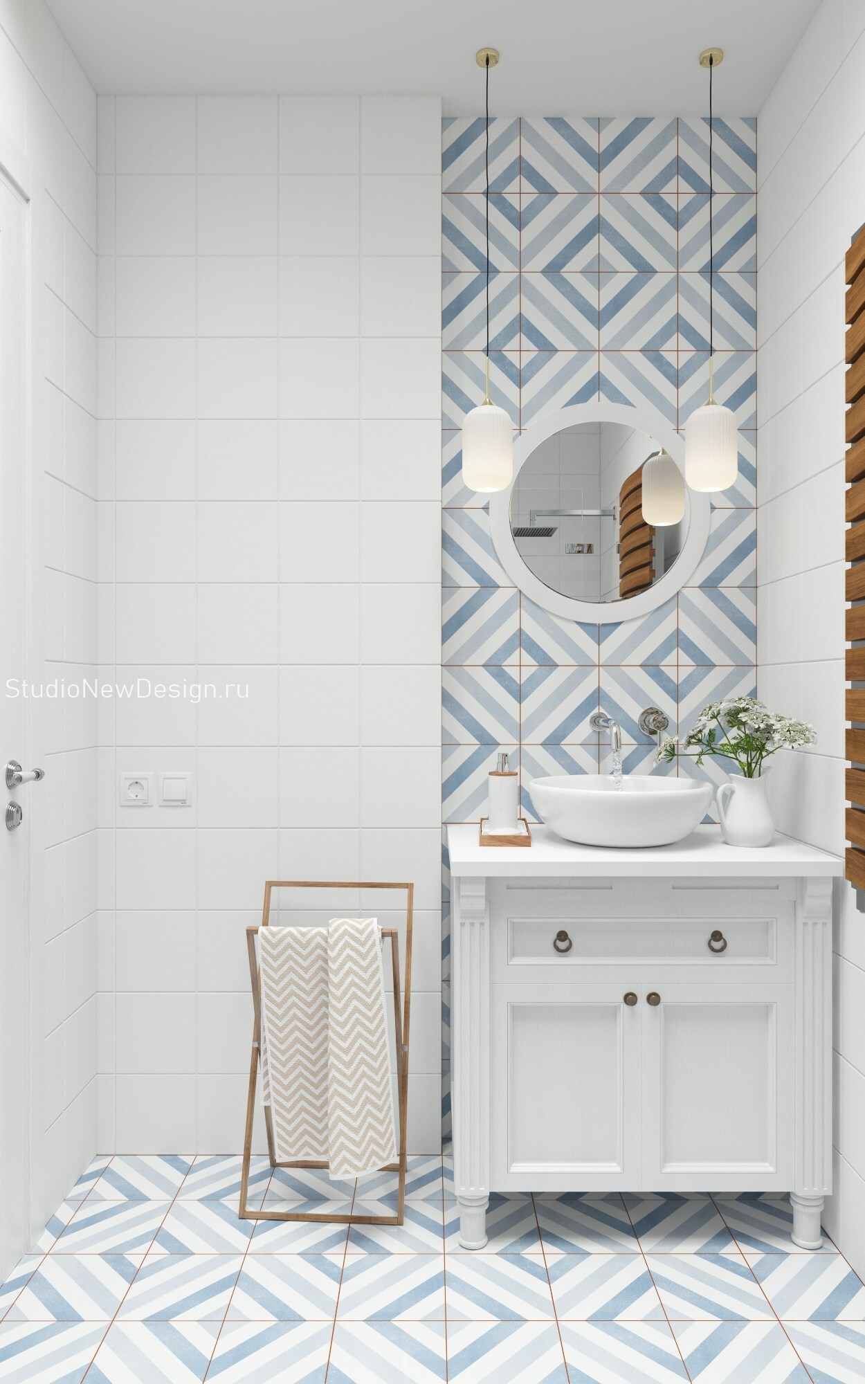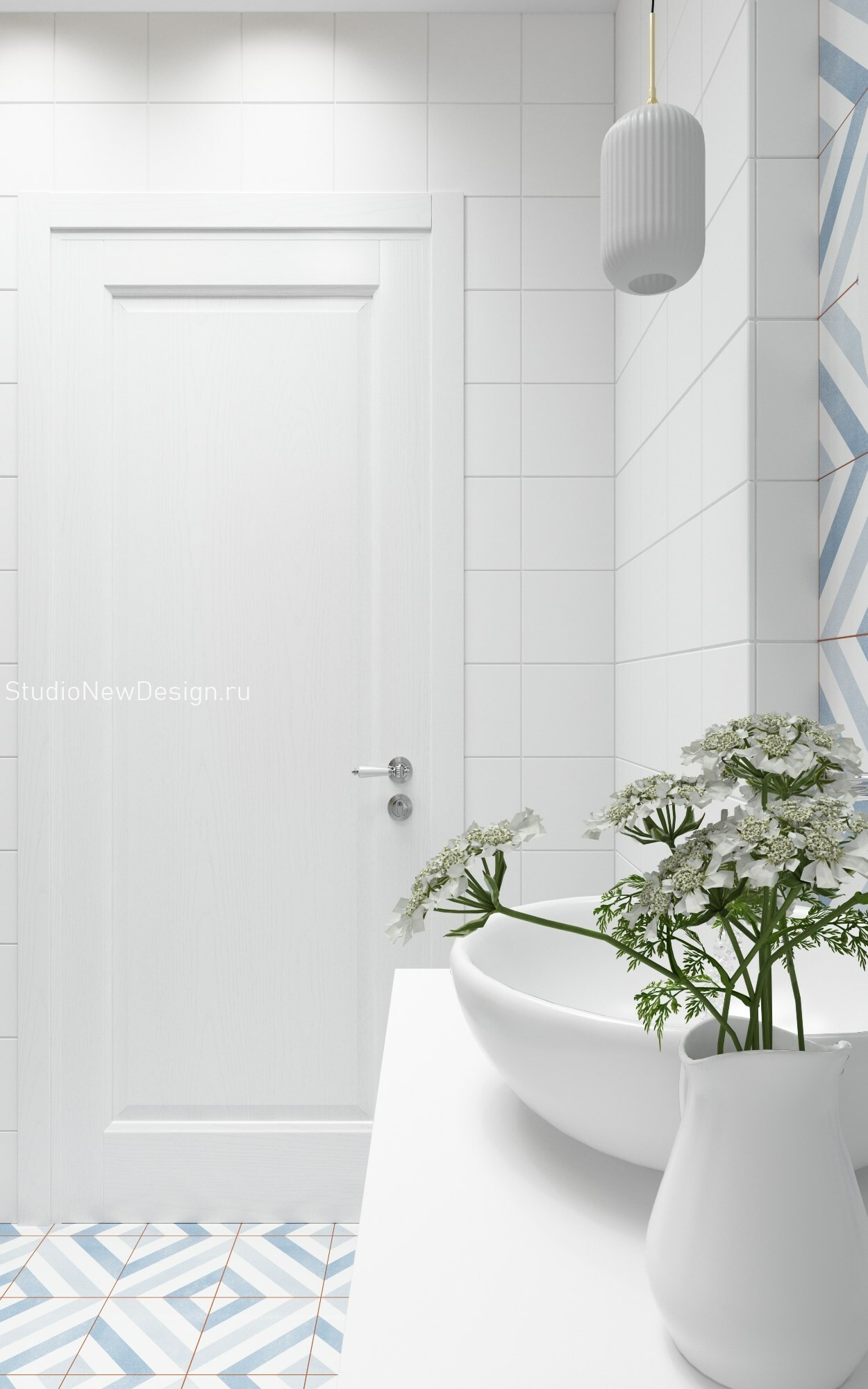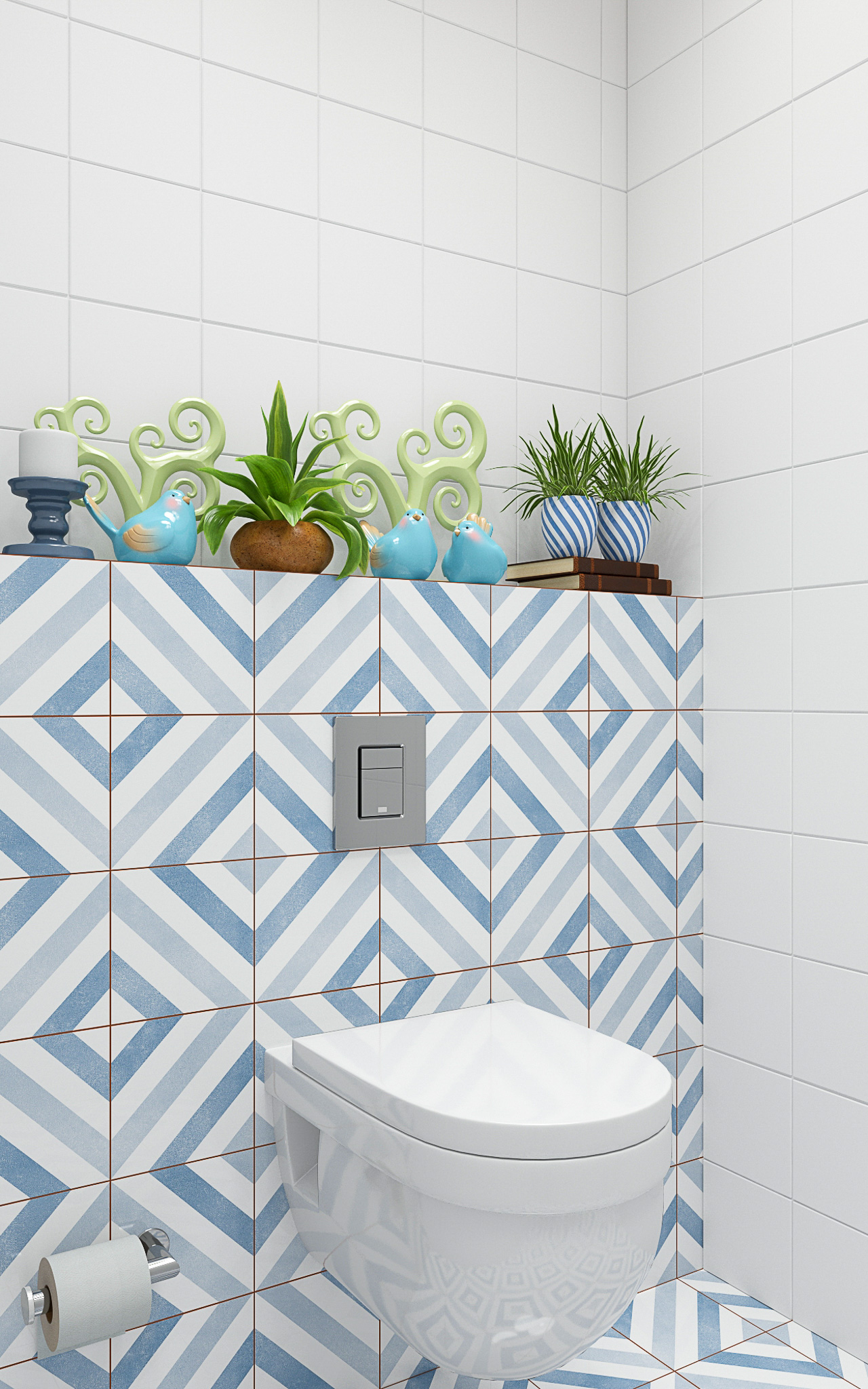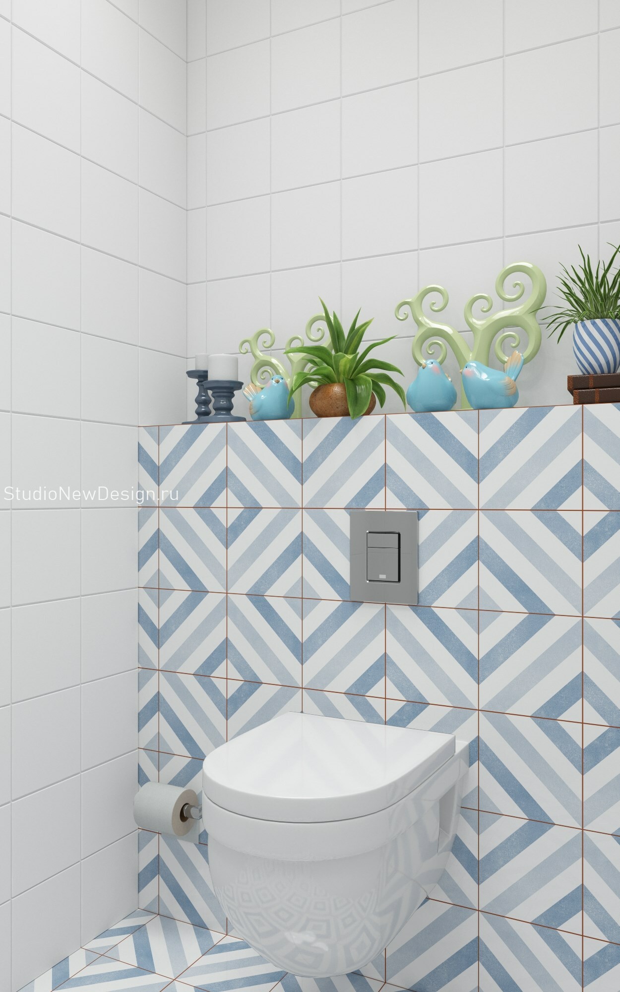 Стены в ванной комнате и туалете выложены белой плиткой, а пол яркой с орнаментом. Это классический прием в оформлении скандинавских интерьеров. При монтаже инсталляции с подвесным унитазом получилась полочка, которую мы украсили декором.