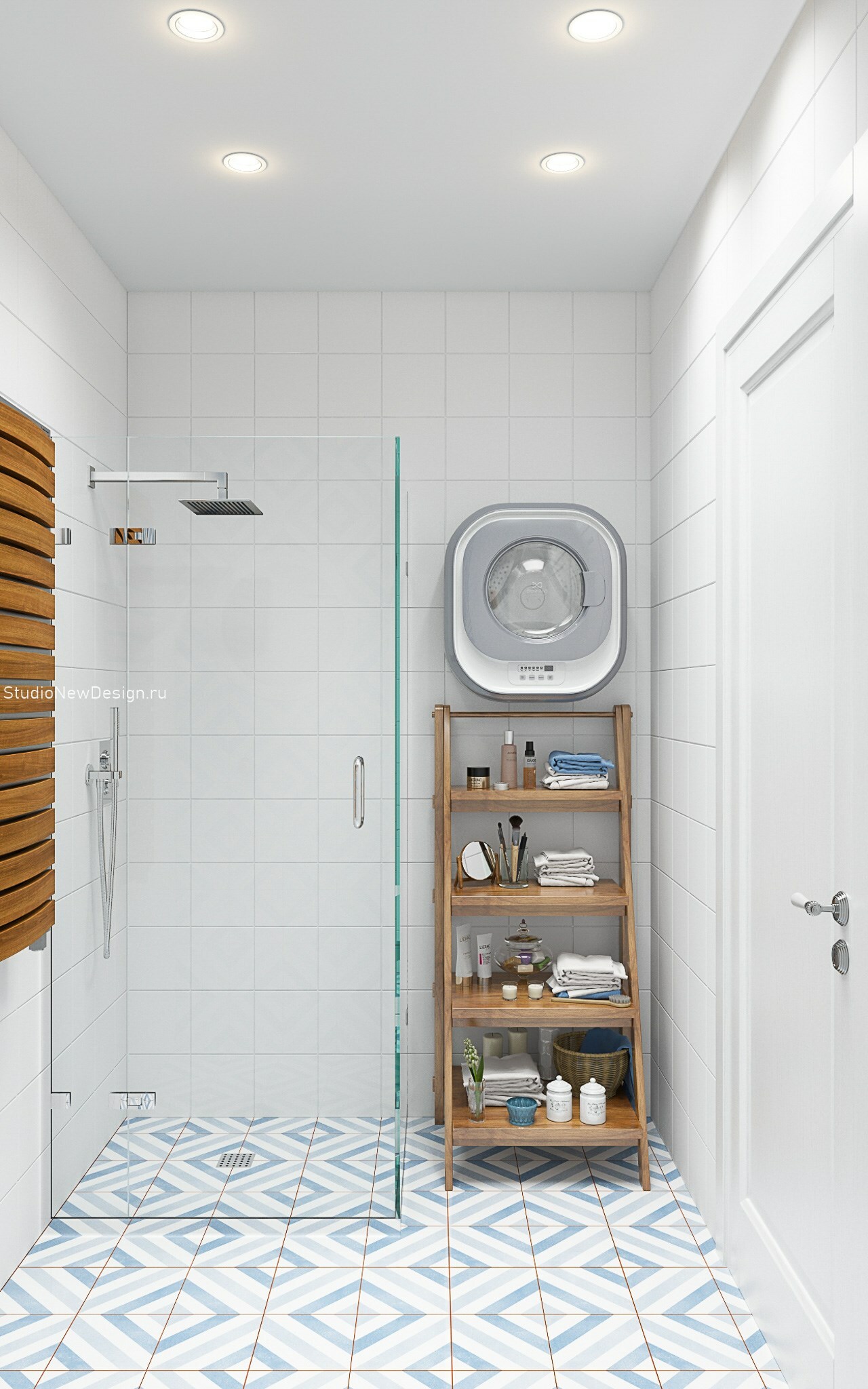 Ванная комната оснащена квадратной душевой кабиной без поддона. Стеклянные стенки и дверки крепятся прямо на пол. В реализации ремонта таких мокрых зон учитывается уровень пола. Он должен быть ниже пола в других помещениях, что указывается в чертежах. Напольная плитка переходит на стену в нише. На тумбе размещается круглая раковина. Композицию дополняют круглое зеркало и светильники. Интересным решением стала подвесная стиральная машина. Под ней мы разместили открытую полку.